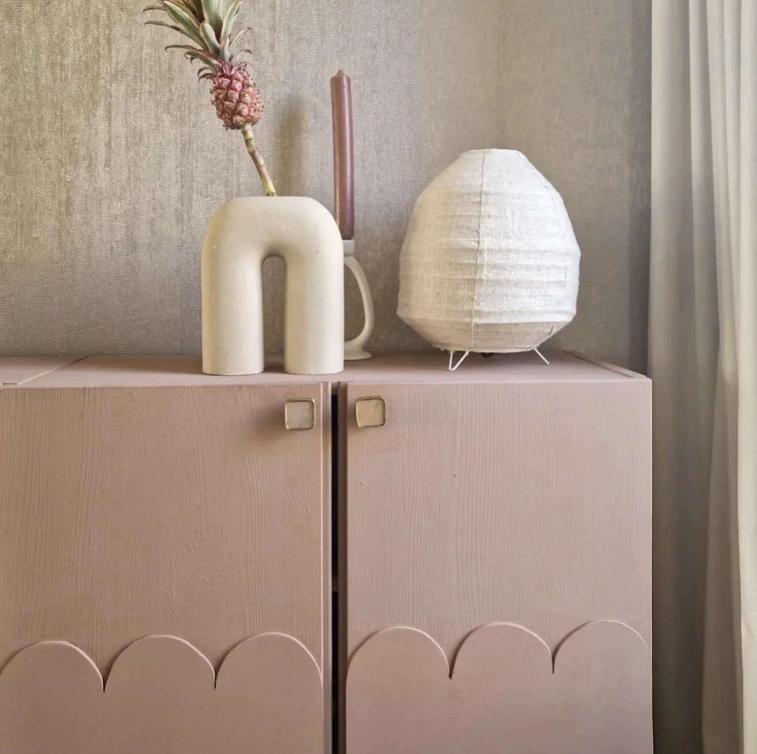 Une première fois customisé à l’aide cannage, les portes ont ensuite été recouvertes de motifs arches réalisés à partir de panneaux de bois MDF, le tout peint dans une jolie teinte rose poudré. Alors, alors ? Coup de coeur pour la version 1 ou la version 2 de cet élégant bahut ?