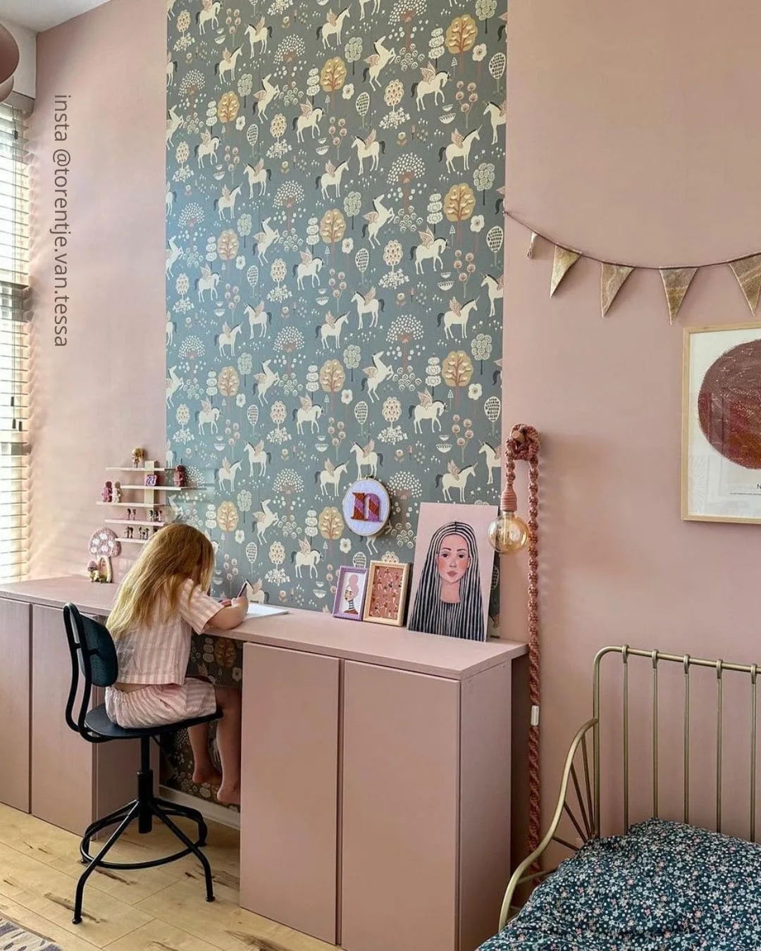 Si tu te sens une âme d’artiste, pourquoi ne pas réaliser, toi aussi, une impressionnante fresque à l’aide de peinture, ou d’un beau papier peint panoramique ? Ici les éléments IVAR recouvrent un pan entier de mur, créant une surface de rangement XXL au-dessus du bureau et dans la chambre, de manière générale.